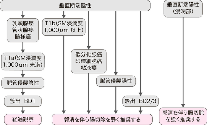 浸潤癌であるpT1癌の治療の原則はリンパ節郭清を伴う腸切除である。しかし,転移リスクが極めて低いpT1癌が存在することも事実であり,そのような症例に対して結果的には過剰治療となる追加切除を可及的に減じることが本基準の作成目的である。現在のところ,リンパ節転移(pN)を確実に予知できる診断法は存在しないが,転移リスクの高低を追加治療実施の判断材料として利用することが可能である。