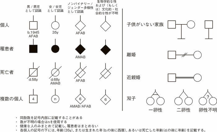 一般的に家系図の記載に用いられている記号を付録図Ⅲ-1に示す。