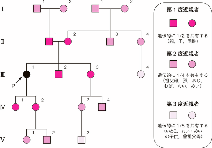 発端者からみた第1,第2,第3度近親者は以下に示すとおりである。「近親」度は遺伝情報の共有の程度を表しており,法律などで親類関係を表す「親等」とは異なる。