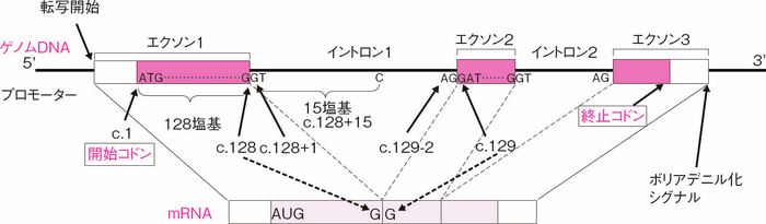 | (2) | コーディングDNAレベルで変化を表記する場合は「c.」で表し,開始コドンATGのA(翻訳開始点)を1として数える(付録図Ⅳ-1のエクソン1の終わりは,開始コドンATGのAから数えて128番目にあるので,c. 128となる)。コーディングDNAとは,蛋白質に翻訳されるDNA配列であり,イントロンは含まれていないので,イントロンの位置を表現する場合は,隣接するエクソンから何番目にあるかを+または-を用いて表記する。たとえば,付録図Ⅳ-1に示すイントロン1の始まりから15番目の塩基は,「c. 128+15」となる。エクソン2の始まり(c. 129)から上流へ2塩基の位置は「c.129-2」と表記する)。 |