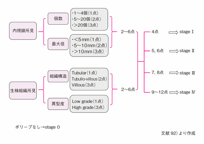 - 国際遺伝性消化管癌学会(InSiGHT)は,大腸腺腫の数と大きさ(polyp burden)を用いた内視鏡的評価によるステージングを提案し(表Ⅱ-2),下部消化管内視鏡検査の間隔や手術適応の判断がpolyp burdenと強く相関することを示した29)。また,経時的にみたpolyp burdenの明らかな増加は,臨床上の手術適応の判断基準として用いられている30)。評価者によるpolyp burdenの一致率は十分とは言えないものの,polyp burdenは下部消化管内視鏡検査の間隔や手術適応を決定し,明らかに増加する場合は,手術を考慮することが提案されている。