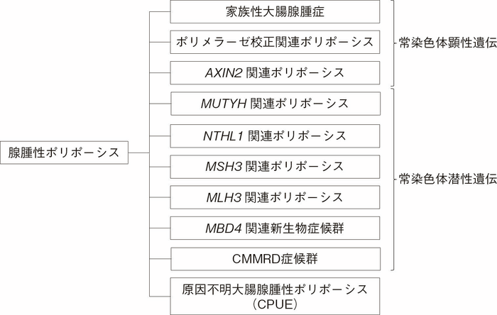 近年,大腸腺腫性ポリポーシスを引き起こす複数の原因遺伝子とその遺伝形式,関連腫瘍を含む随伴病変が明らかとなり,原因遺伝子ごとにサーベイランスや治療,血縁者への対応が提案されている(CQ1)。それに伴い,原因遺伝子にちなんだ疾患名の命名が増えつつあり,FAPとgastric adenocarcinoma and proximal polyposis of the stomach(GAPPS)(Ⅱ-2-2:鑑別を要する疾患・病態)を併せてAPC関連ポリポーシス(APC-associated polyposis(conditions))との総称を用いられることがある1,2)。また,FAPを含む腺腫性ポリポーシスを生じる疾患を腺腫性ポリポーシス症候群(adenomatous polyposis syndrome)と総称することがある1)。