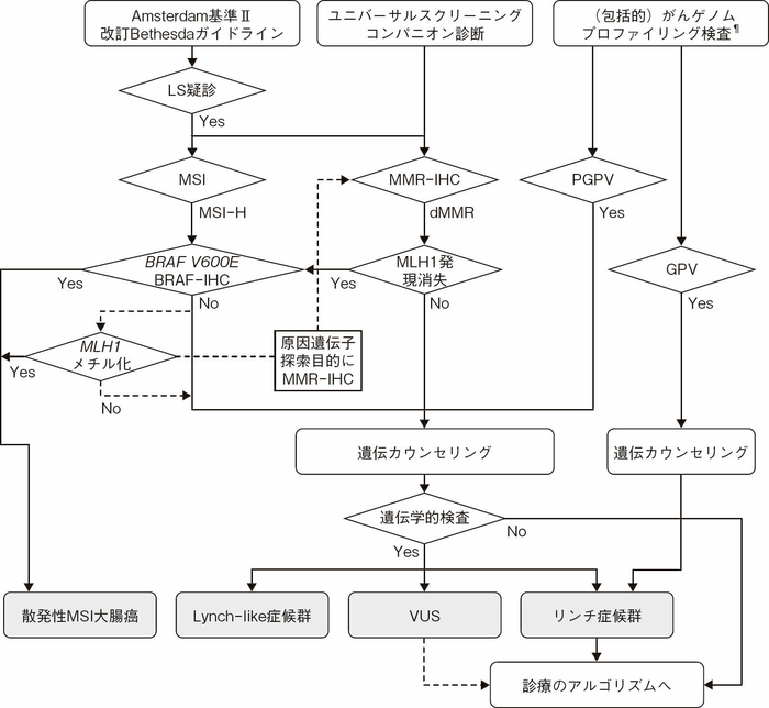 LS:リンチ症候群,MMR:ミスマッチ修復,IHC:免疫組織化学,MSI:マイクロサテライト不安定性,MSI—H:高頻度マイクロサテライト不安定性,PGPV:生殖細胞系列病的バリアント疑い,GPV:生殖細胞系列病的バリアント,VUS:意義不明バリアント