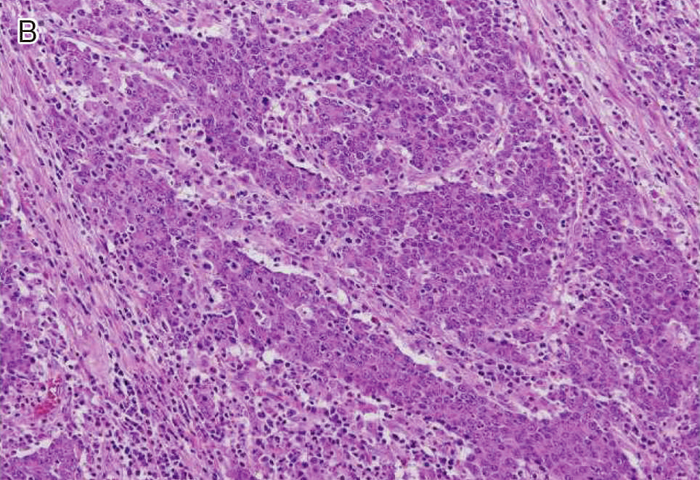 | B: | 髄様増殖。腫瘍細胞は腺管を形成せず,充実性胞巣状の増殖を示す。 |