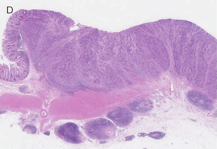 | D: | Crohn様リンパ球反応。腫瘍周囲に多数のリンパ球の集簇巣を認める。 |