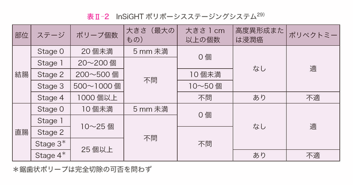 - 国際遺伝性消化管癌学会(InSiGHT)は,大腸腺腫の数と大きさ(polyp burden)を用いた内視鏡的評価によるステージングを提案し(表Ⅱ-2),下部消化管内視鏡検査の間隔や手術適応の判断がpolyp burdenと強く相関することを示した29)。また,経時的にみたpolyp burdenの明らかな増加は,臨床上の手術適応の判断基準として用いられている30)。評価者によるpolyp burdenの一致率は十分とは言えないものの,polyp burdenは下部消化管内視鏡検査の間隔や手術適応を決定し,明らかに増加する場合は,手術を考慮することが提案されている。