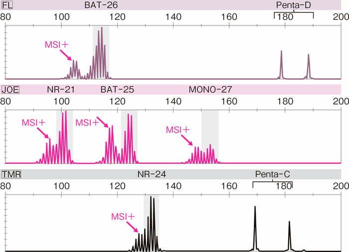5種類の1塩基繰り返しマーカーの全て(BAT-25,BAT-26,NR-21,NR-24,MONO-27)で,腫瘍組織のマイクロサテライト長が基準となり,MSI-Highと判定される。