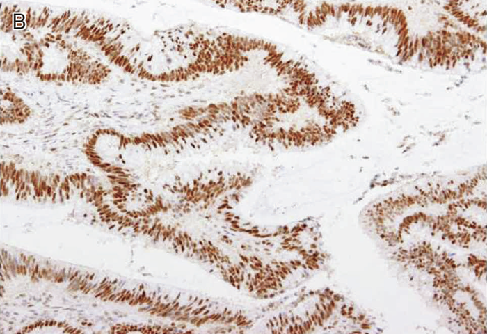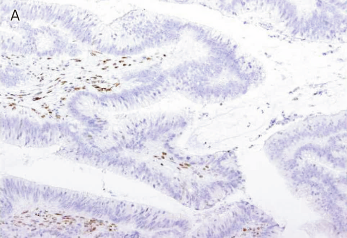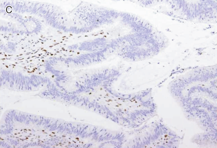 図Ⅲ-5 MLH1に生殖細胞系列病的バリアントを有するリンチ症候群に伴う大腸癌におけるMMR-IHC検査例