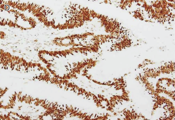 MLH1蛋白質(A),PMS2蛋白質(C)の発現消失を認める。MSH2蛋白質(B),MSH6蛋白質(D)の発現は保たれている。いずれの染色においても内部陰性対照となる間質細胞の陽性所見が認められる。