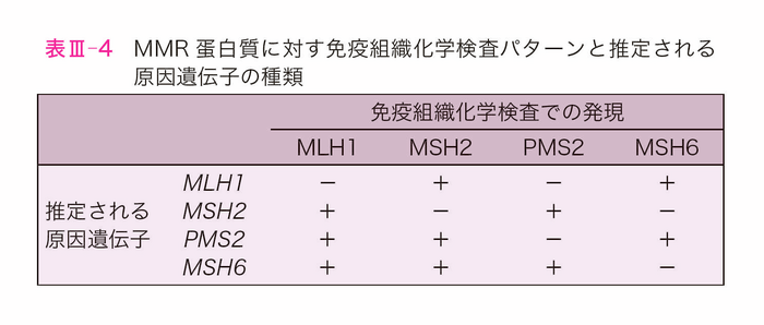 MMR蛋白質に対する免疫染色パターンで原因遺伝子の種類が推定できる。MLH1バリアントを有する腫瘍はMLH1蛋白質に加えてPMS2蛋白質,MSH2バリアントを有する腫瘍はMSH2蛋白質に加えてMSH6蛋白質の発現消失を伴う(表Ⅲ-4)。